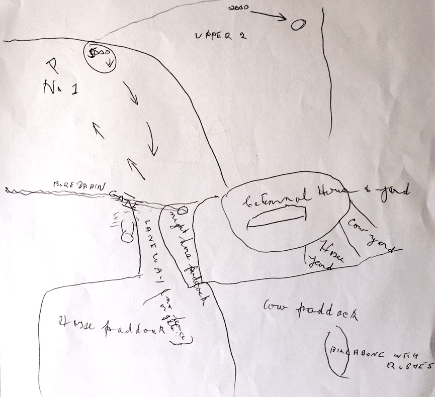 They were the worst kind of storms that day, Full of fireworks but little rain, so predictably, about 2pm there were a few fires started. There was one very active one with huge clouds of black smoke on our northern neighbours’ property Cairn Hope. My father and two men set off to help fight it. There was a good wind from the west so the fire was moving steadily to the east. At that direction it would not reach Catumnal. It burned on for hours until it was many miles long across our northern boundary. Then the wind turned from its previous direction and blew in from the north. This headed the length of the whole fire down onto Catumnal. It was very frightening. There were no men on the place and we could see that they could not get back because the whole area of the road would now be ablaze. This left me, Mum, Irene the lady help, and Mr Bingley, a very large half crippled carpenter (doing some repairs on the house) on the place to deal with getting the sheep out of the way of the fire. I knew I was the only one who could do anything about it and I was really panicky. I knew that I had to spend sometime sitting down and making of foolproof plan. I forced myself to do this, calm down and think clearly. I surmised that the homestead would be safe. On the west was the night paddock closely cropped, adjoining the eaten out laneway; on the north was a long stretch of lawn and then a large tennis court adjoining a ploughed orchard. On the east was the front entrance gate with a large bare area inside it adjoining the house garden and the south had bare ground as well with shale paths leading to sheds and horse and cow yards. Yes it should be protected. Finally I came up with a plan. I asked Irene to go down to the windmill on the house dam and leave it turned on to keep plenty of water in the overhead tank to defend the house. I asked Bingley to put all the hoses on the taps at various points of the house and asked Mum to stand guard on one of them when the fire came close. The dogs were to be tied up in the empty ungrassed cow yard, and then I told everyone I was going up as far as I could in number 1 paddock, the closest to the fire, to bring the sheep down to the bore drain area which was eaten out. The bore drain flowed from west to east across number 1. It ended in the house dam. I asked Irene two open the gate into the laneway when she saw me coming and then I’d put the sheep through it. I asked her to then prevent the sheep getting out the only unfenced side of the laneway with the help of the dogs. A tall order, but our only hope. The laneway was cut into number 1 to provide water from the bore drain for the horses in the large horse paddock. The laneway was about 100 yards long and 50 yards wide and fenced on three sides, and with gates to allow the tractor and (word illegible) through.